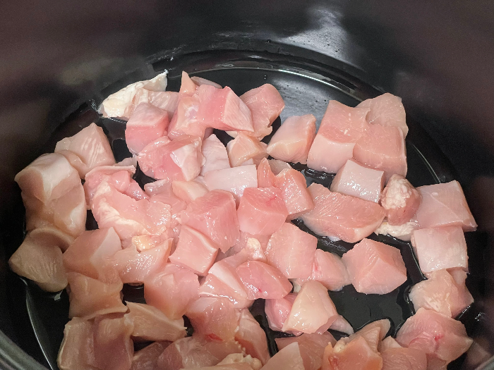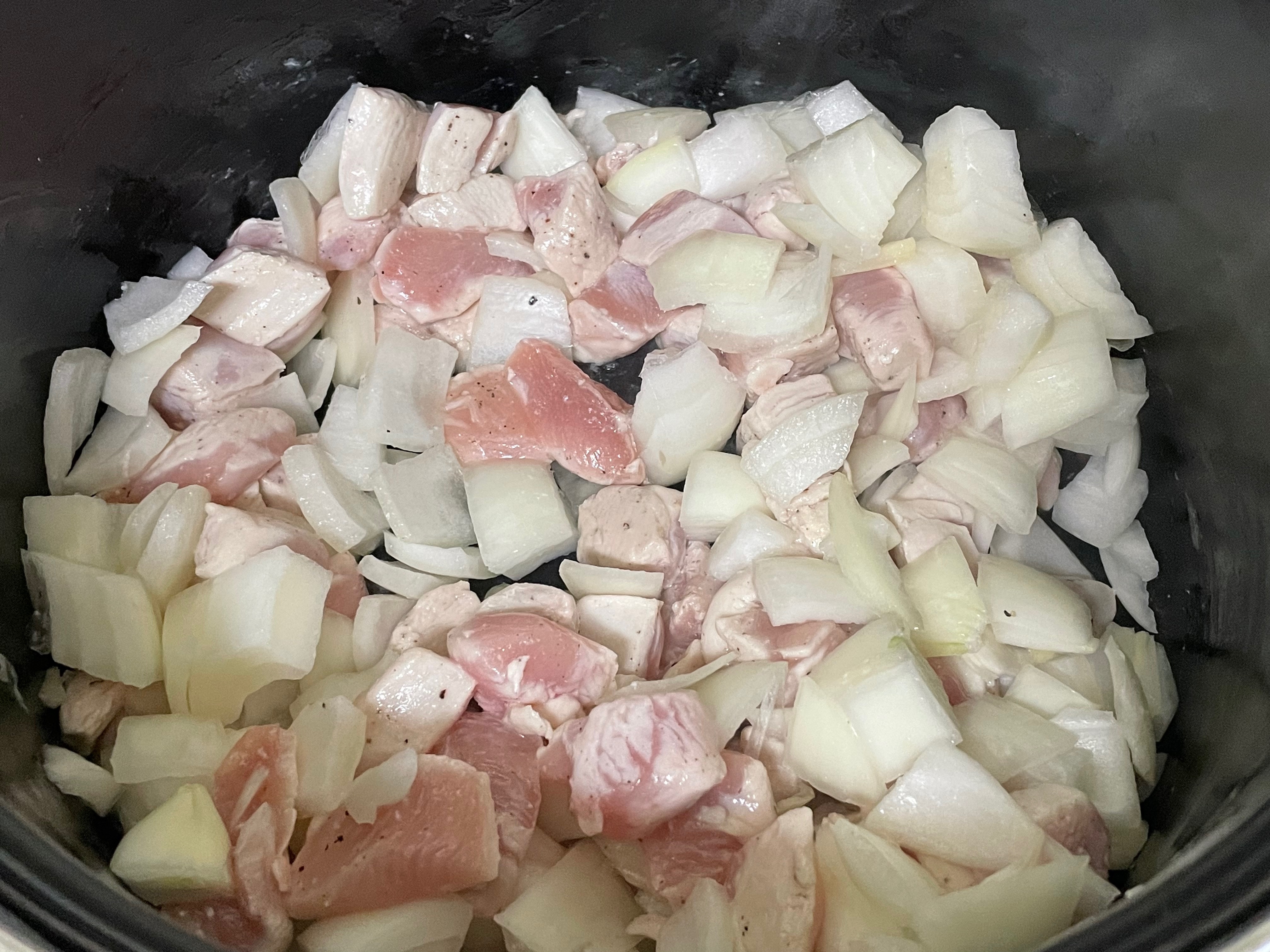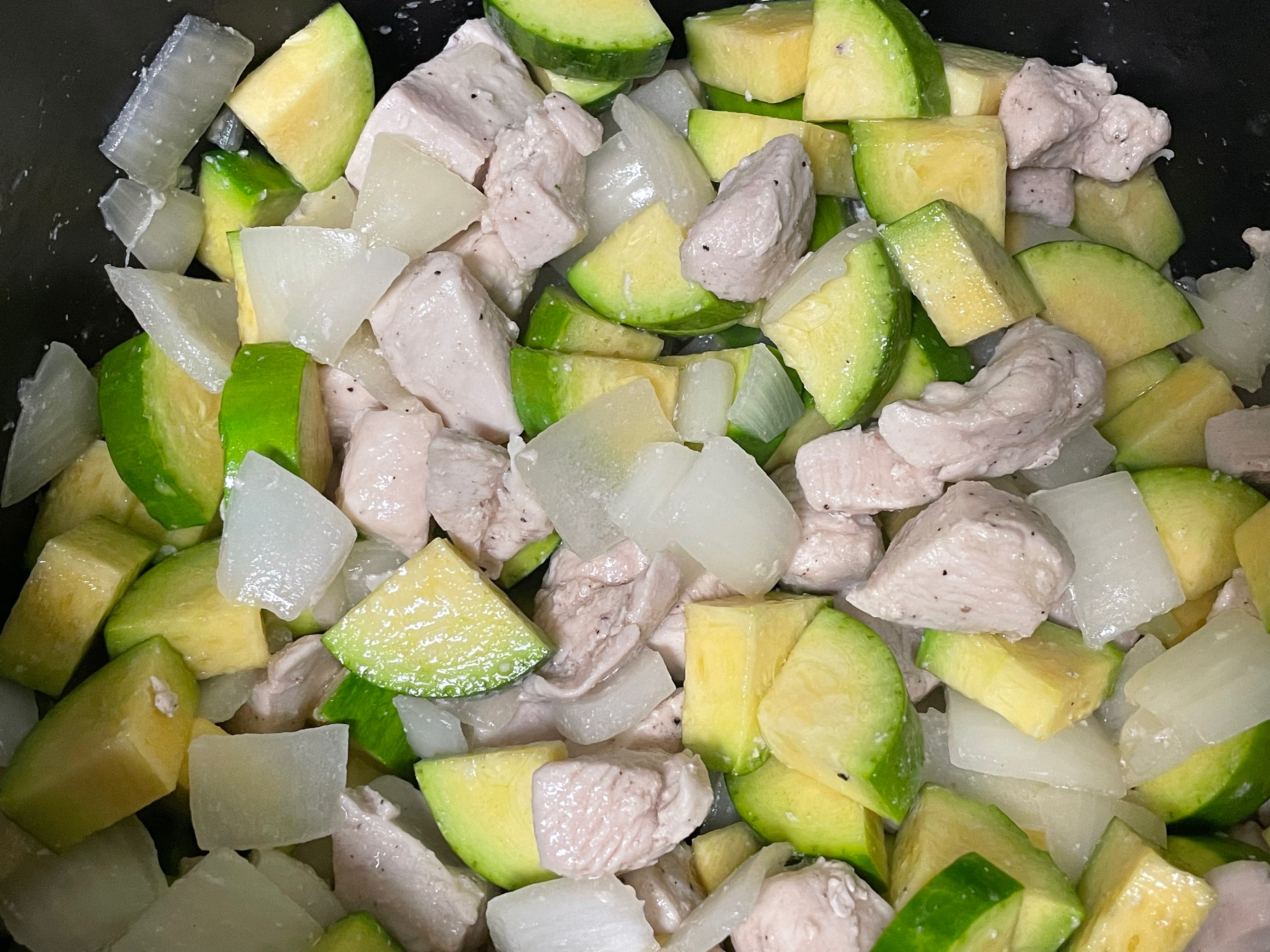 1. 각각의 재료들을 적당히 원하는 크기로 썰어준 후 큰 냄비에 올리브유를 두르고 닭가슴살에 소금, 후추 간을 하고 "중불"로 볶아주세요