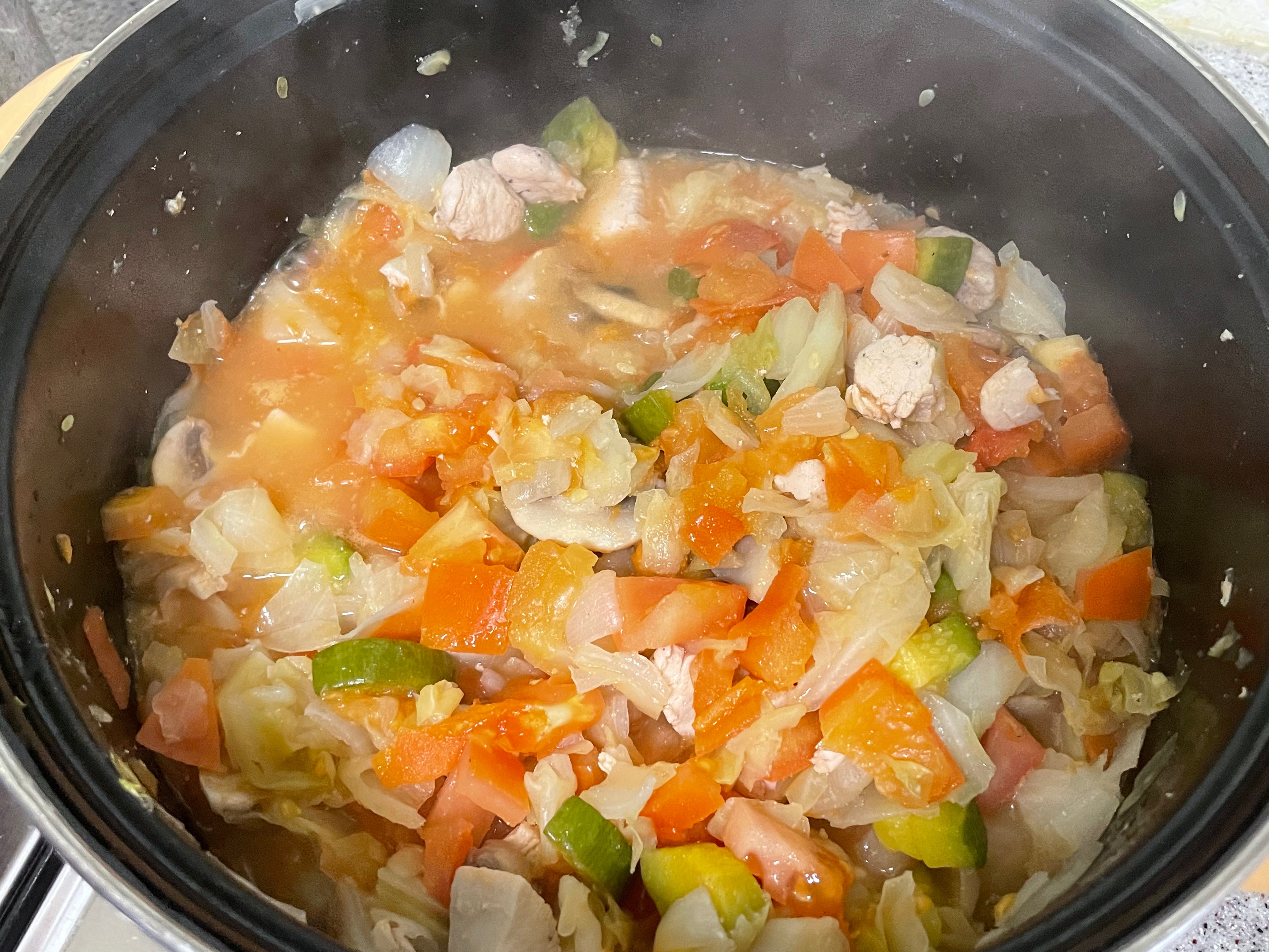 야채에서 수분이 계속 나오기 때문에, 물은 수프의 농도를 조절하는 정도로만 넣어주세요!