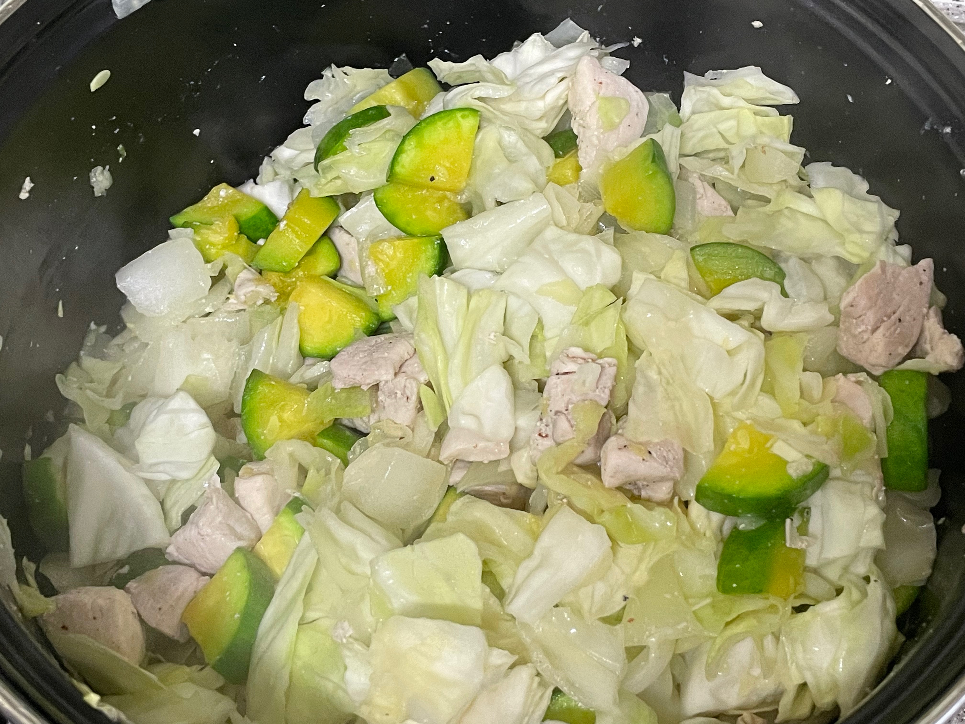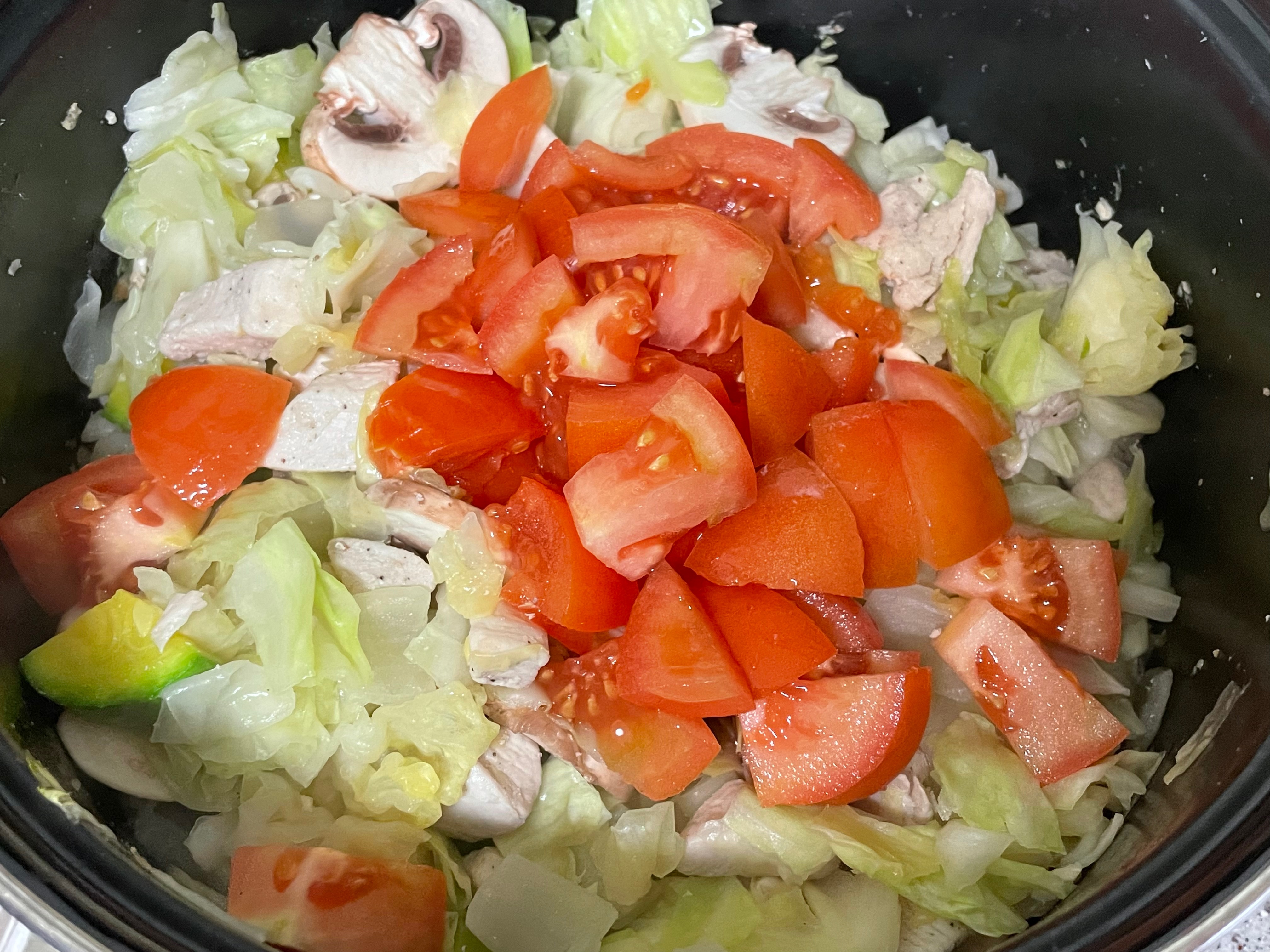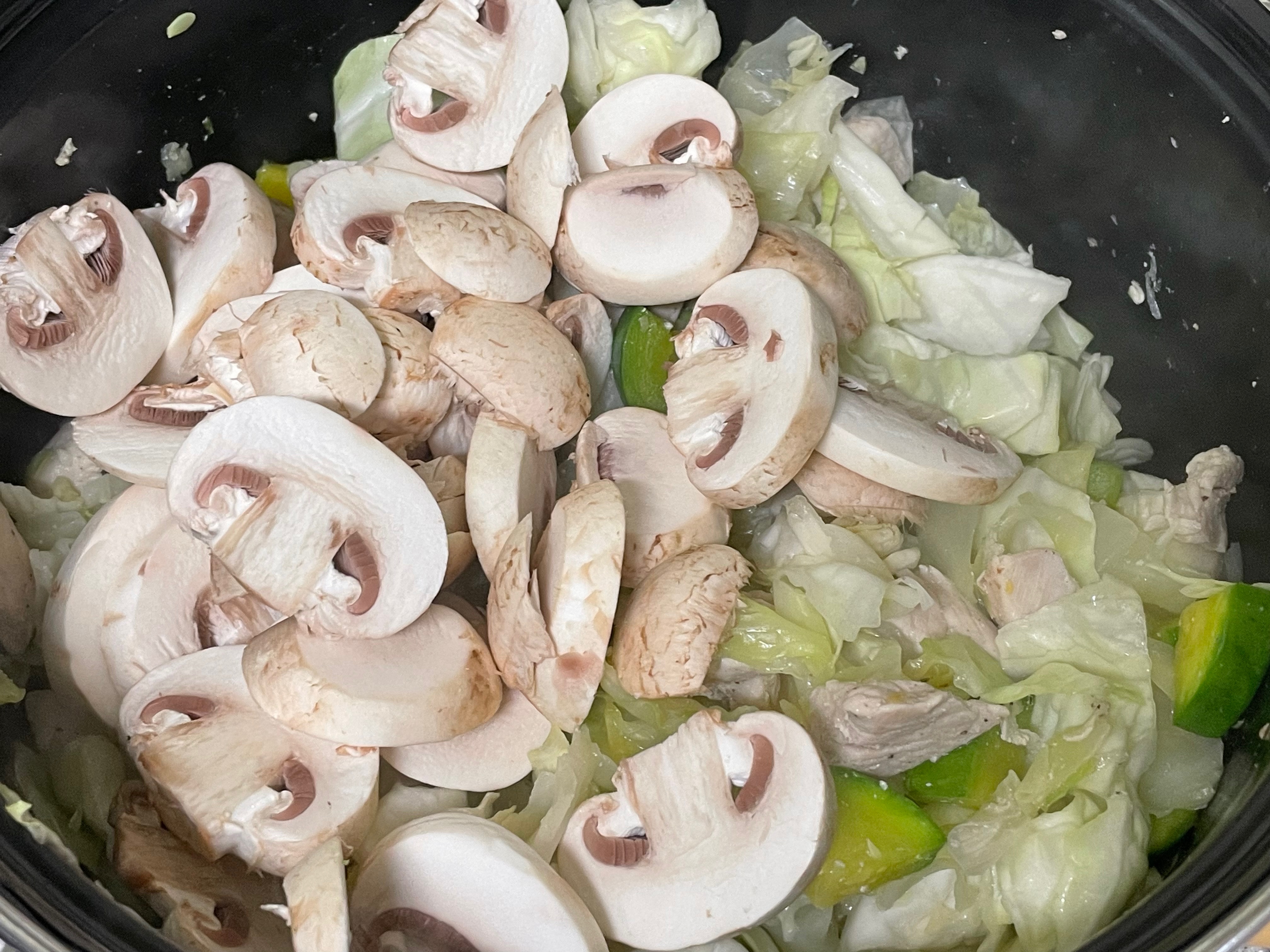 3. 양배추 절반을 먼저 넣고 물이 나오면서 적당히 숨이 죽으면 나머지 절반과 양송이를 넣고 잘 섞어준 뒤 "약불"로 변경해 주세요